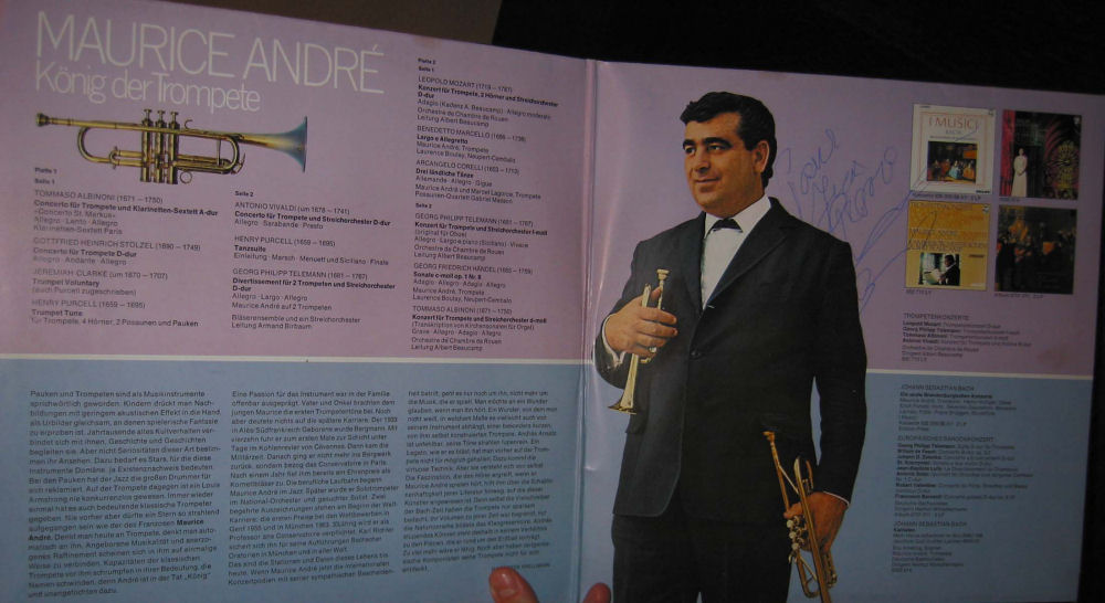 where André signes an old LP cover. To the right of André, his wife, Liliane (who was born in
